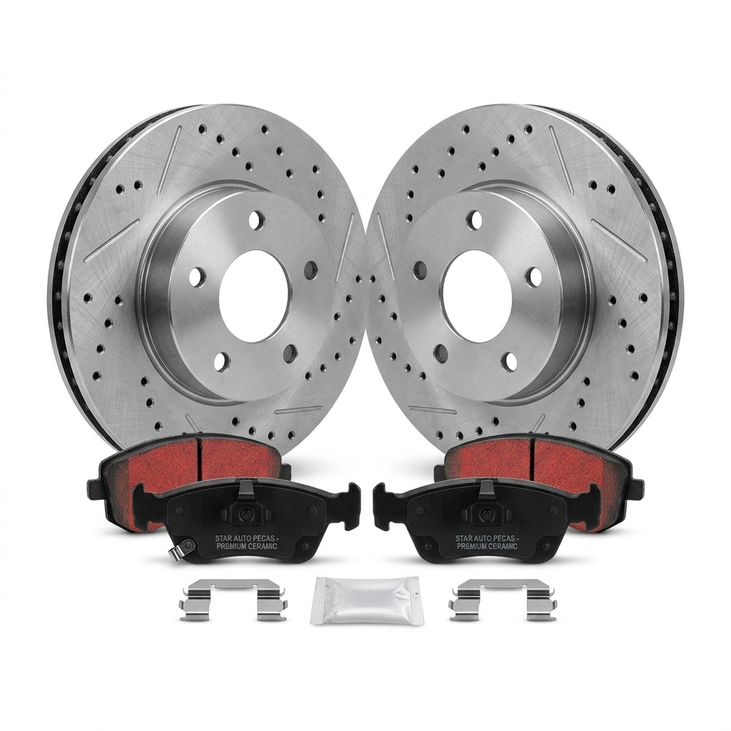 Amortecimento e frenagem de ponta para o seu veículo. Este kit premium inclui 02 Discos de Freio Ventilados de 12 Polegadas e 04 Pastilhas de Freio Semi-Metálicas com material de fricção de cerâmica vermelha visible.